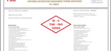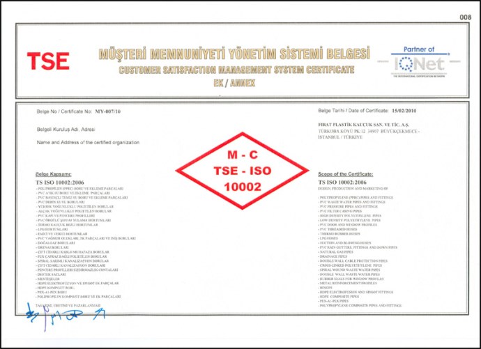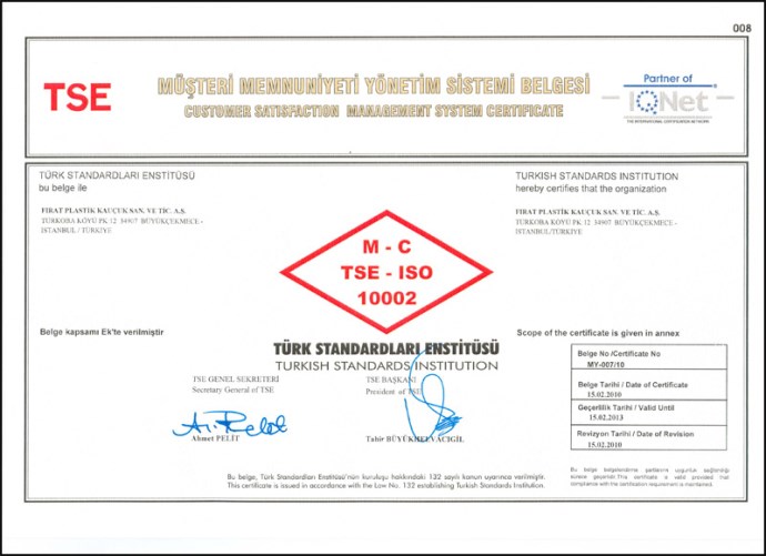 بهدف إدارة شكاوى الزبائن بواسطة نظام مجدي (وضمن نطاق منظمة المعايير الدولية) التي تنشر "معايير إرضاء الزبائن وإدارة الشكاوى" ((International Organization for Standardization أنه نتيجة للتدقيق والمراقبة الموثقة التي حصلت في مصانع فرات بلاستيك من قبل معهد المعايير والمواصفات التركية(T.S.E) بتاريخ 02-03-04 فبراير شباط 2010 بنتيجة هذا التفتيش إستحقت شركتنا الحصول على شهادة إدارة نظام إرضاء الزبائن TSE - ISO 10002.