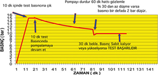 لايجب ان ينخفض الضغط بأكثر من 30% خلال 60 دقيقة. وفي الحالتين تكون التجربة قد انتهت. بعد إجراء المراقبة وضبط الحرارة على الخط تجري إزالة جميع الإجهادات عن الخط وبعد ذلك تجري إعادة التجربة الاولية.