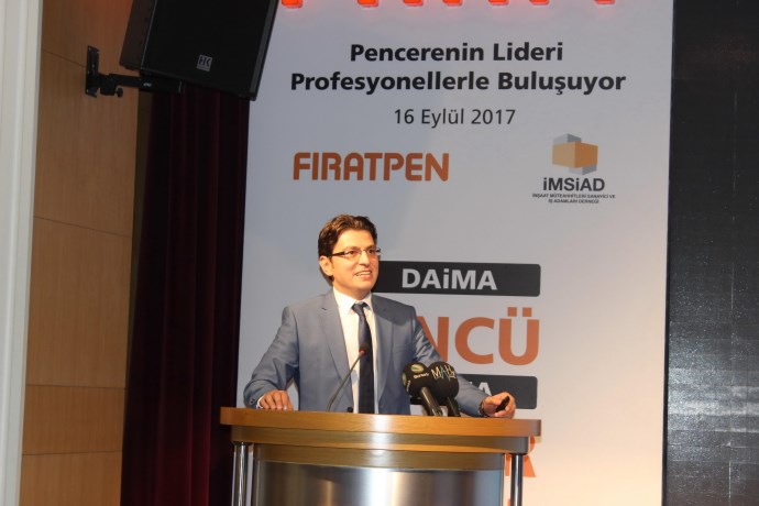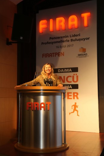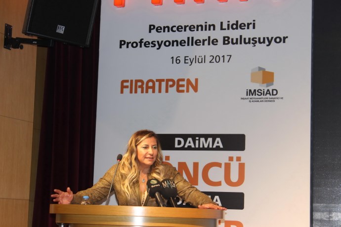 Sn. Gökçadır'dan sonra söz alan Fırat Profil Paz. Md. Sn. Dr. Mehtap Uluceviz sunumuna katılımlarından dolayı İMSİAD'a teşekkür ederek ve bu işbirliğinin önümüzdeki dönemlerde karşılıklı faydaya dönmesini dileyerek başladı. Bursa'da gerçekleştirilen kentsel dönüşüm projelerinde markaların yıllarca sorunsuz hizmet vermesinin gerekliliğini ve yerli sermayeli firmaların tercih edilmesinin ülke ekonomisine katkılarını dile getiren Uluceviz, sektörün milli lideri olarak her projeye uygun mühendislik çözümlerinin olduğunu vurgulayarak Fırat hakkında genel bilgilendirmeyle devam etti. Türkiye'nin ilk 50 sanayi firmasından biri olan Fıratpen'in pvc pencere sektörünün iç pazar ve ihracat lideri olduğunu vurgulayan Uluceviz, hem yerli hem de milli sermaye ile bunu başardıklarının altını çizdi.