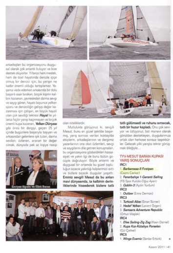 Türkiye Açıkdeniz Yarış Kulübünün organize ettiği XI. Yat Yarışlarında Sponsorluğunu üstlendiğimiz “Barbarossa Fıratpen” adlı yatımız yıl boyunca sürecek olan ve çeşitli etaplardan oluşan kupa yarışlarında genel sıralamada 2.durumdadır.